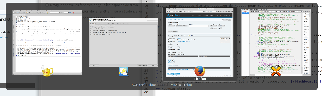 - Le gestionnaire de fenêtre a une nouvelle boîte de dialogue thémable pour la rotation parmi les fenêtres ouvertes avec Alt+Tab.